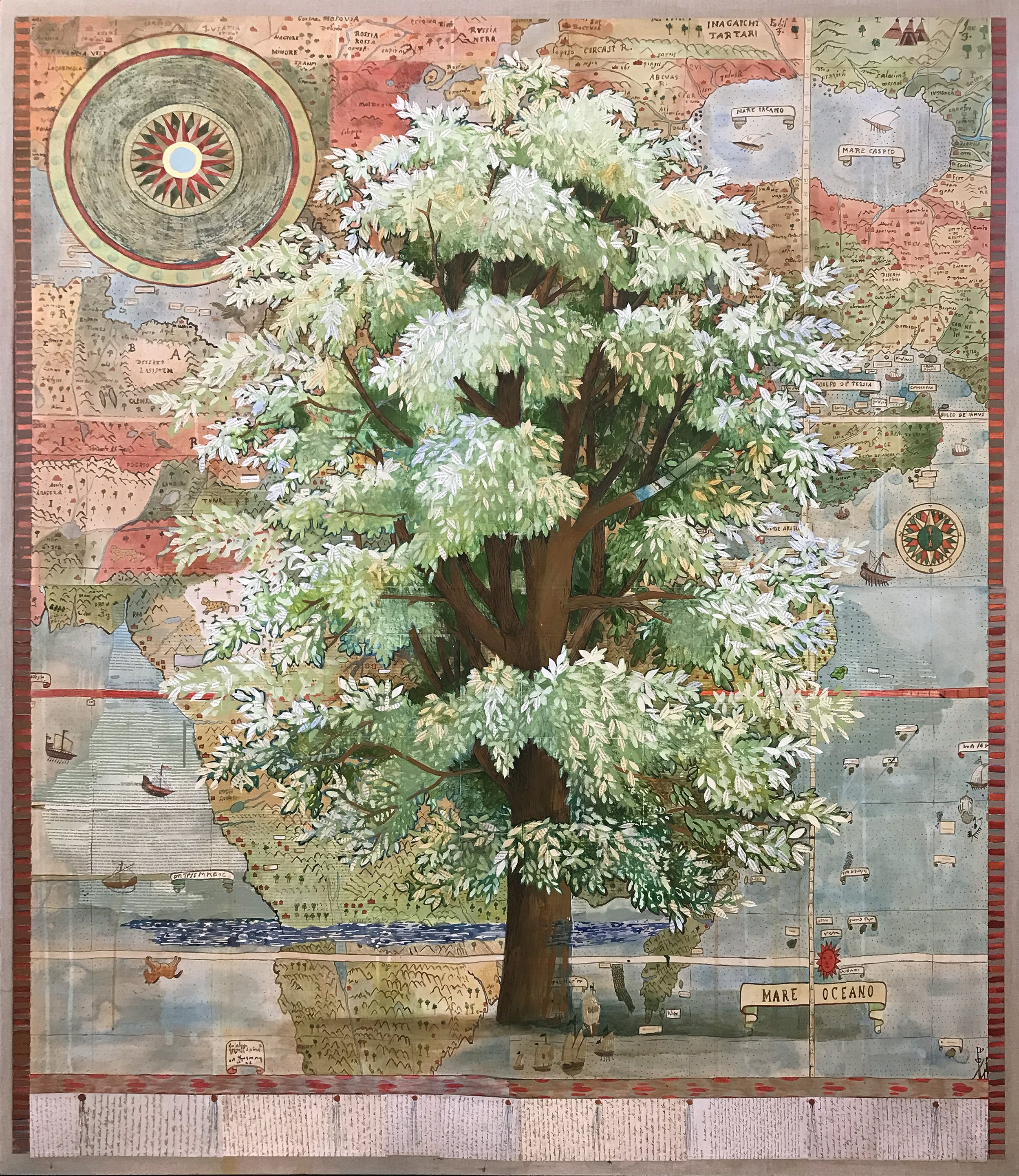 Acrylic, color pencil, collage on silk, mounted to canvas, 72” x 62”